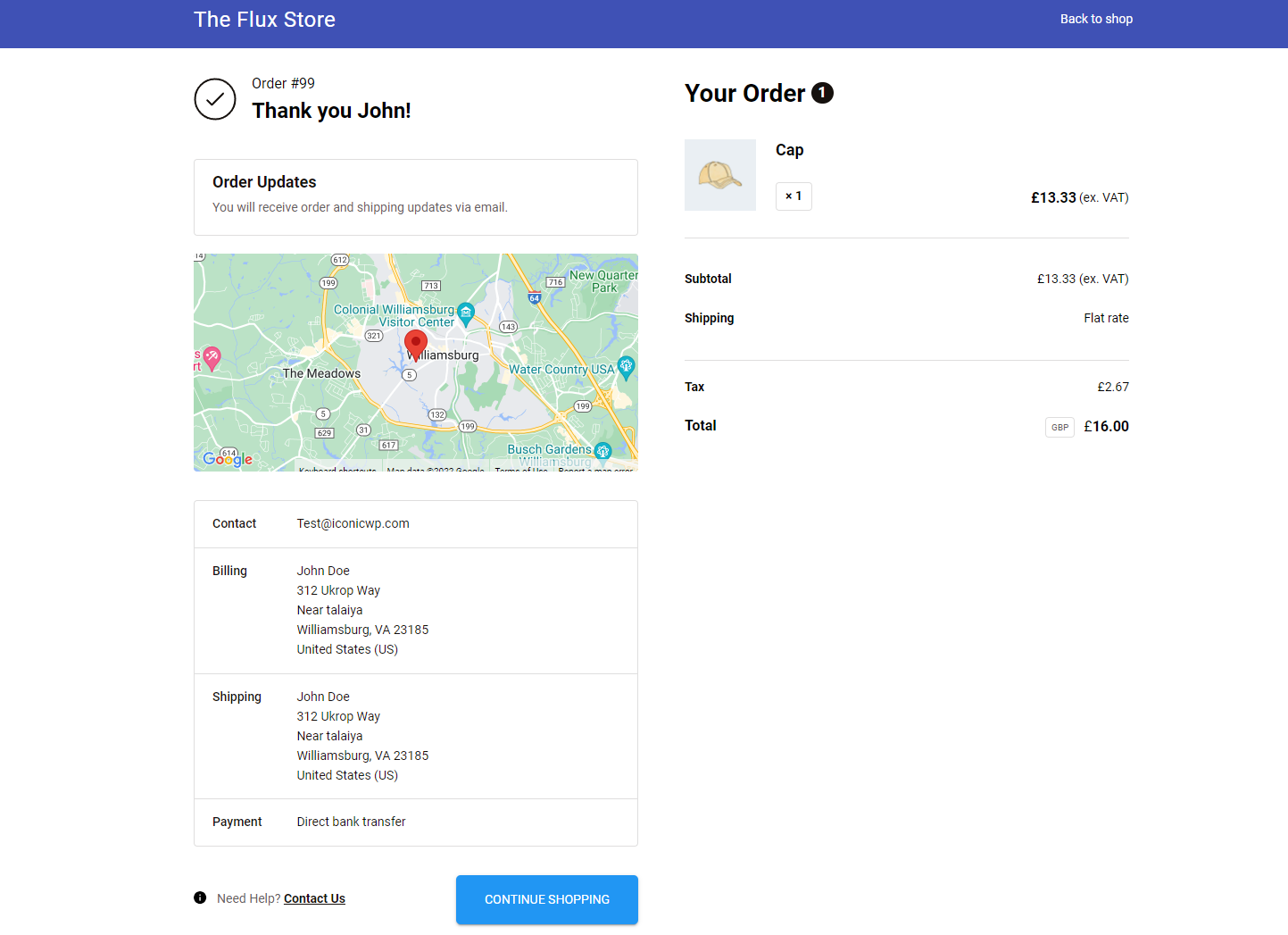 Visual confirmation is incredibly important for customers once they’ve checked out. Seeing their address is great, but Flux Checkout’s Thank You page allows you to show a map as well – giving your customers peace of mind.