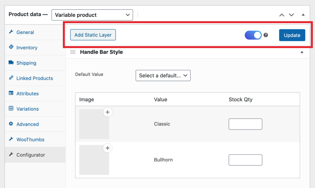 We determined that creating a toolbar in the configurator tab would be beneficial. It makes it easier and more accessible to add static layers, update the product, enable Configurator, and soon, add multiple views/angles.