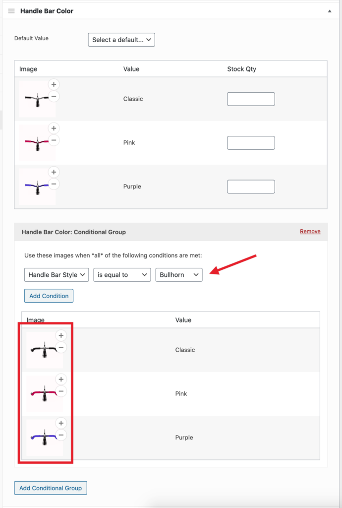 This is where conditional layers can help. When setting up the Handle Bar Color image layers, we can add a condition layer group that says “if the Handle Bar Style is X, use these images instead”. Otherwise, we’ll use the default images assigned to Handle Bar Color.