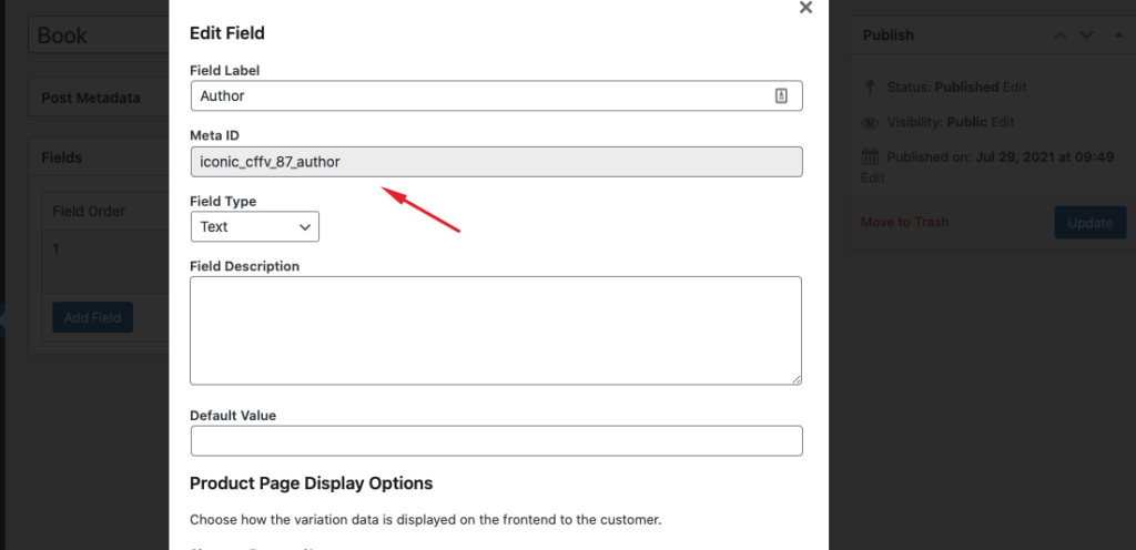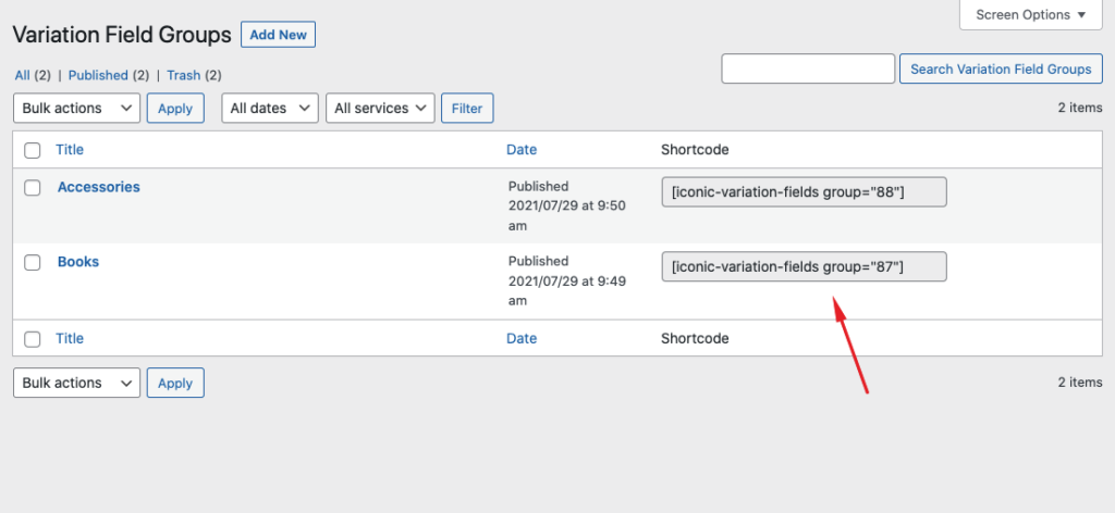 id– You can explicitly mention the ID of the product for which custom fields will be displayed. If you omit theidparameter, it will attempt to inherit the ID of the current product.group– You can mention the ID of the custom field group. When this argument is used then fields from only the specified group will appear on your site. You can also copy this shortcode from Product > Variation Field Groups.