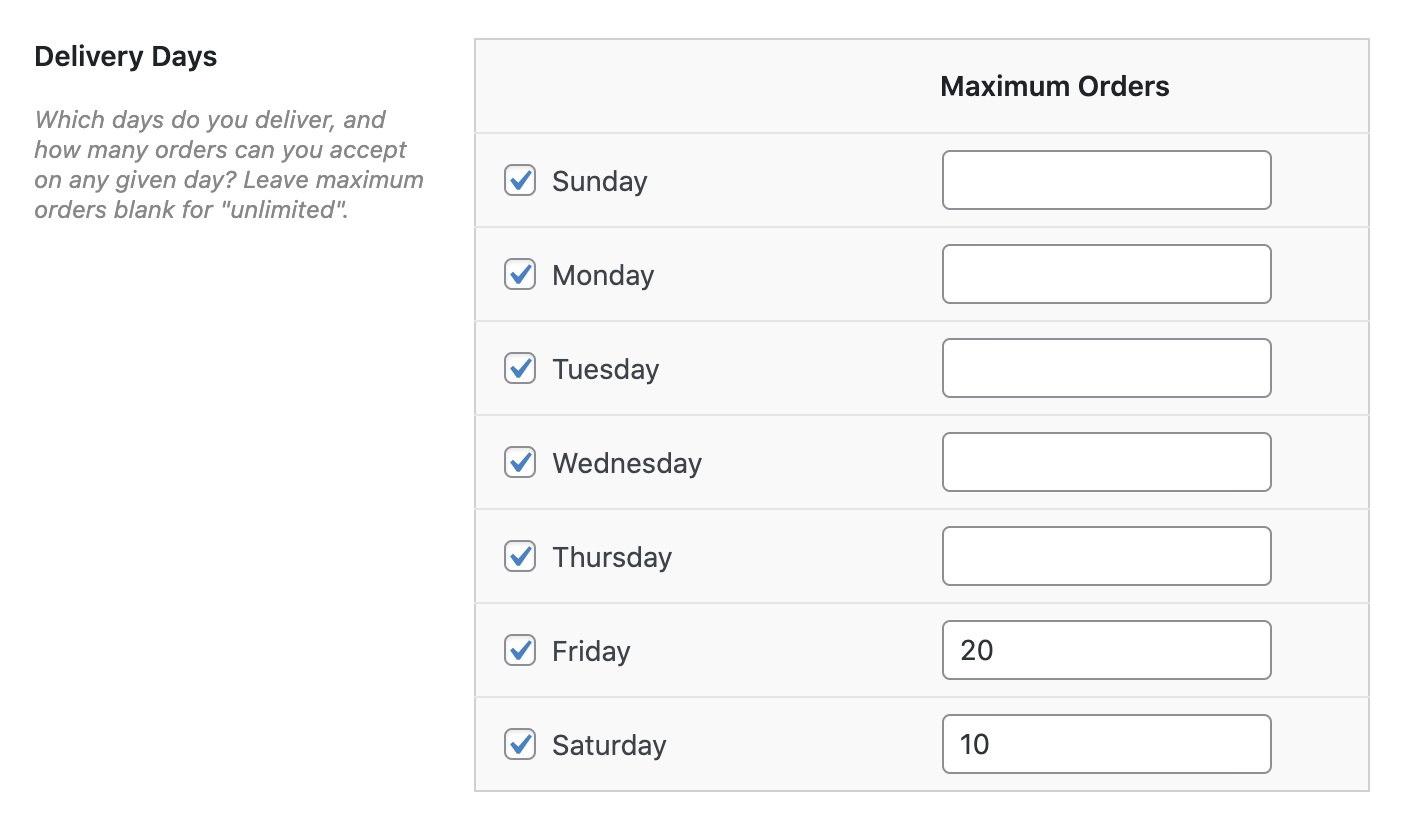 Enter a maximum order or product limit into the Maximum Orders field for each day of the week. Leave it empty to apply no limit.