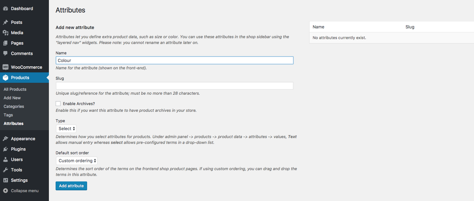 1. From your WordPress dashboard, go to Products > Attributes.