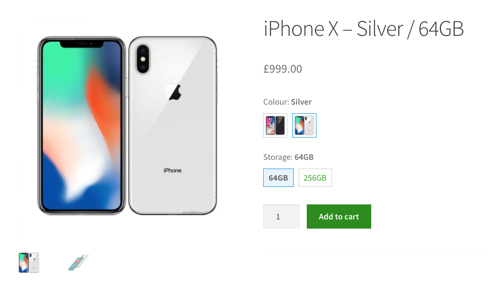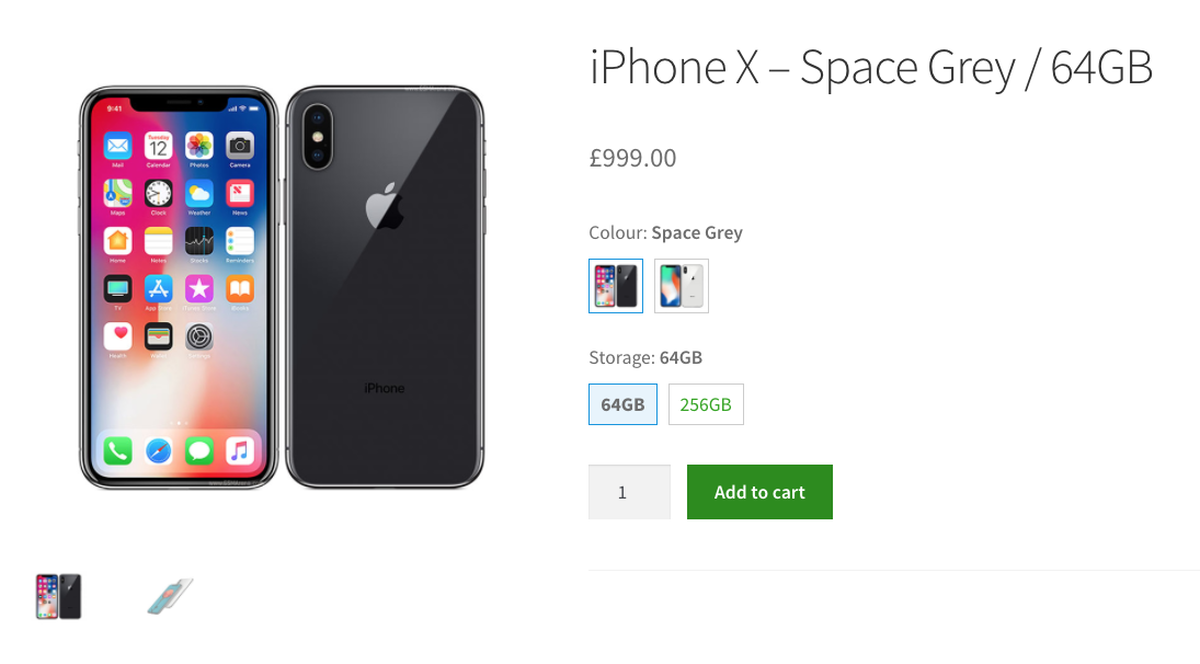 2. You’ll now see the product has Color and Storage options available. The Color options show the product images, as per our settings (in step 6 of ‘Create the Linked Variations group’).