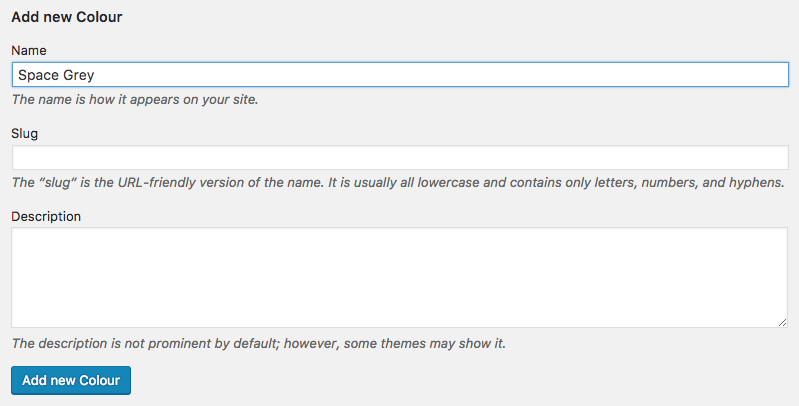 6. Leave the other fields blank and then click the blue Add new Colour button at the bottom of the page.
