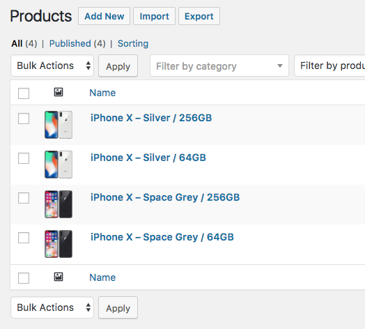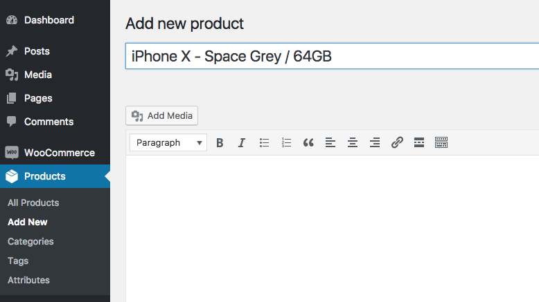 For this example, we’ll be creating a variation group of iPhones. The iPhone comes in different colors and storage amounts. So, our products will be linked by the attributes of Color and Storage.