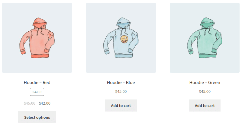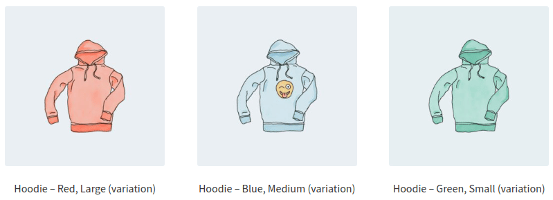 For example, in the image below, the Hoodie variations use color and size attributes.