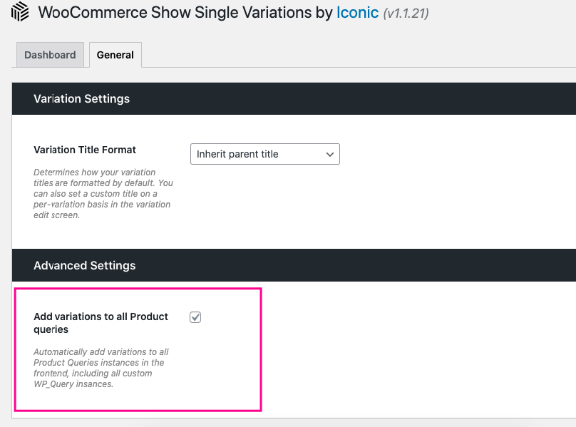 When checked, SSV would add variations to all queries that output ‘products’ posts.