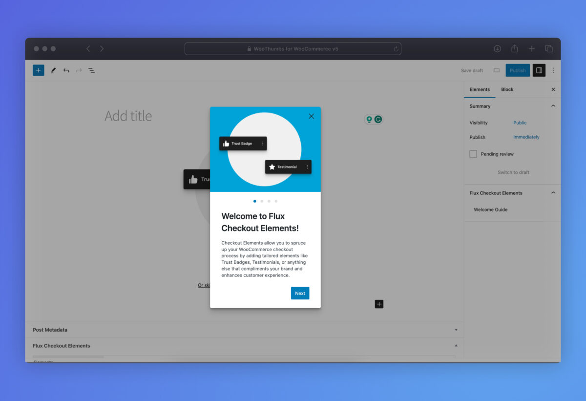 - Create custom checkout banners, messages, and interactive blocks with Elements and the WordPress block editor.
